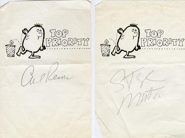 What does Steve Martin's autograph have to do with this? He was there in a box seat near us. Mike nudged me and told me that Carl Reiner was over there, so I wandered over and got their autographs.
